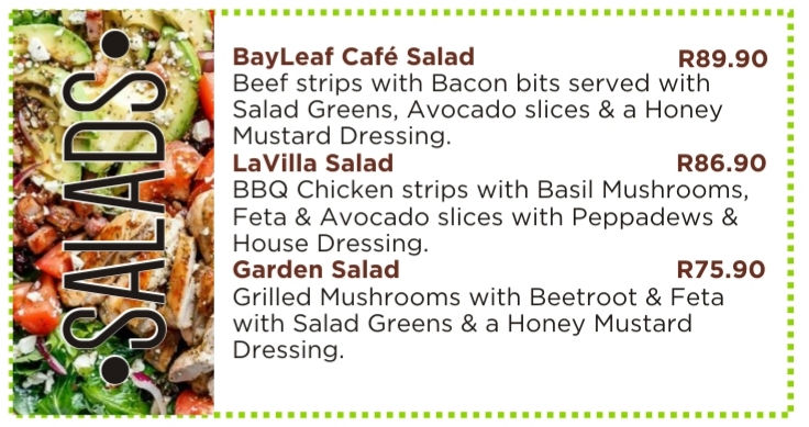 We have a variety of Dishes all made with passion and lots of love. We have two branches to choose from, Bayleaf Bistro in Baywest Mall and our sister store Bayleaf Cafe at Metlife in Kabega Park.